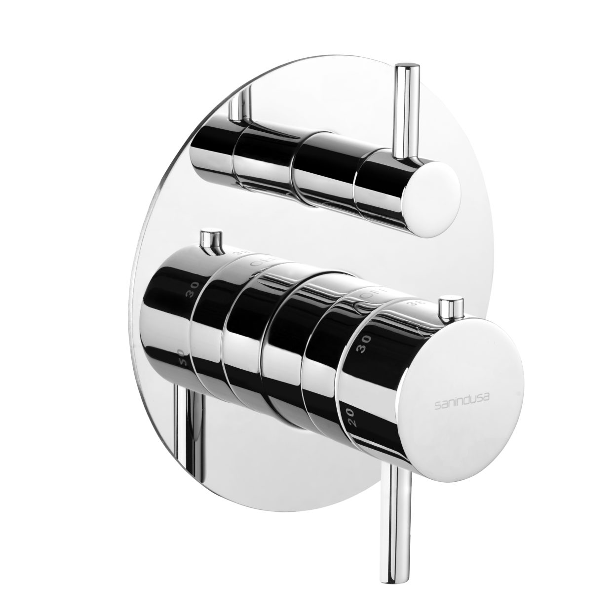 Sanindusa New Icone douchethermostaat inbouw (rond) 3 weg. Dit houdt in dat er 3 uitgangen zijn voor een regen- of stortdouche, handdouche en massagestraal. De kraan is volledig messing verchroomd, hierdoor is deze verzekerd van een lange levensduur. Tevens is hij uitgevoerd met een temperatuurbeveiliging tot 38 graden. Verder is de kraan gemakkelijk met maar één hendel te bedienen.